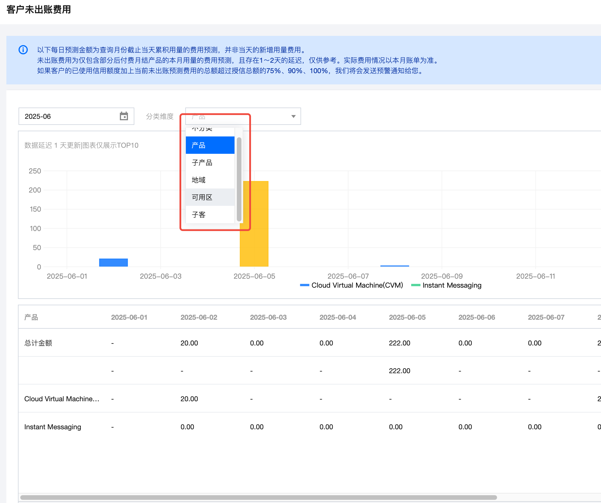 查看直接子客目前支持维度:产品、子产品、地域、可用区、子客。