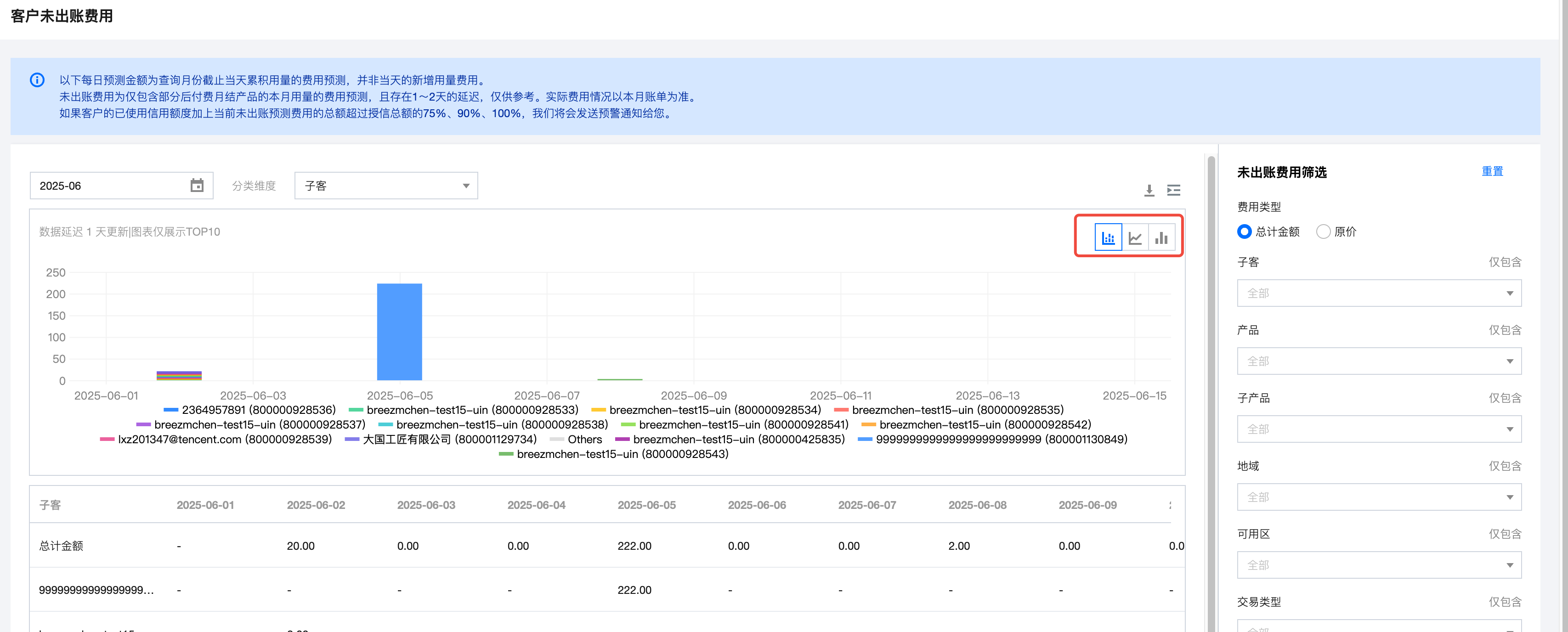 合作伙伴可以查询其名下所有子客的后付费月结产品每日的未出账费用预测数据,同时系统会自动发起预警通知,避免累积较大额度信用击穿。