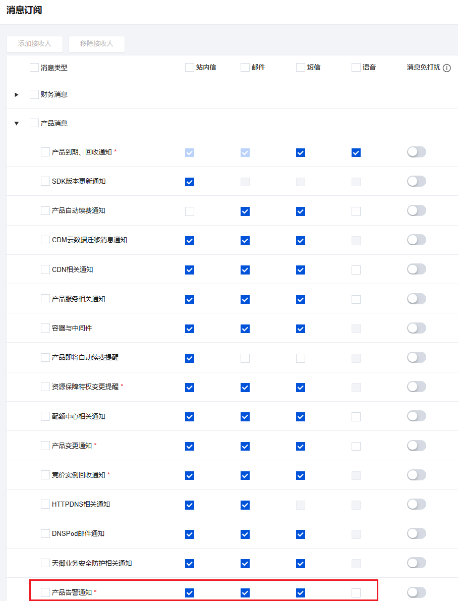 如您不希望收到该预警通知,取消勾选“产品告警通知”对应通知方式即可。