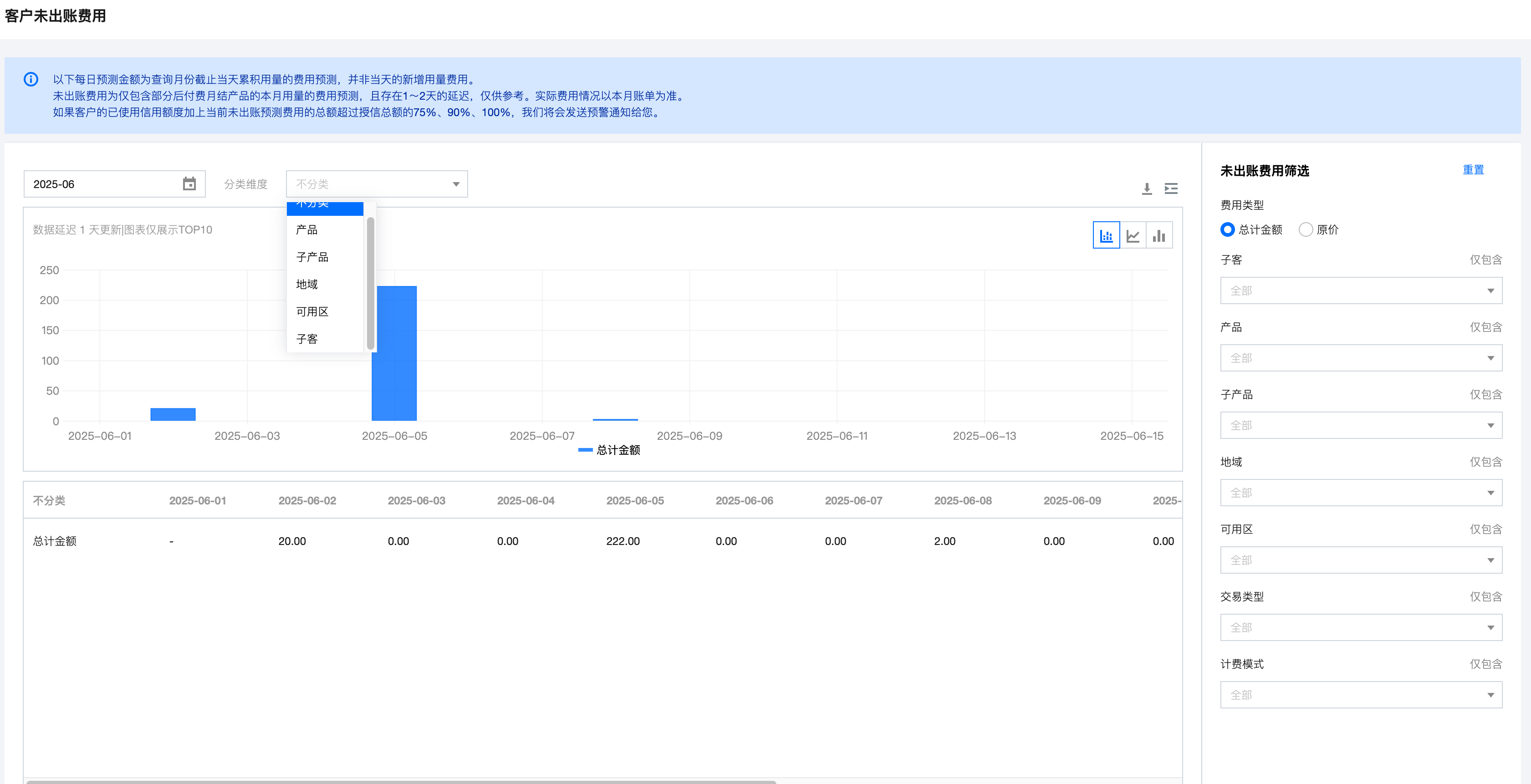 分类维度主要用于对指定范围内的未出账费用数据进行聚合,体现在该维度下的分布情况。