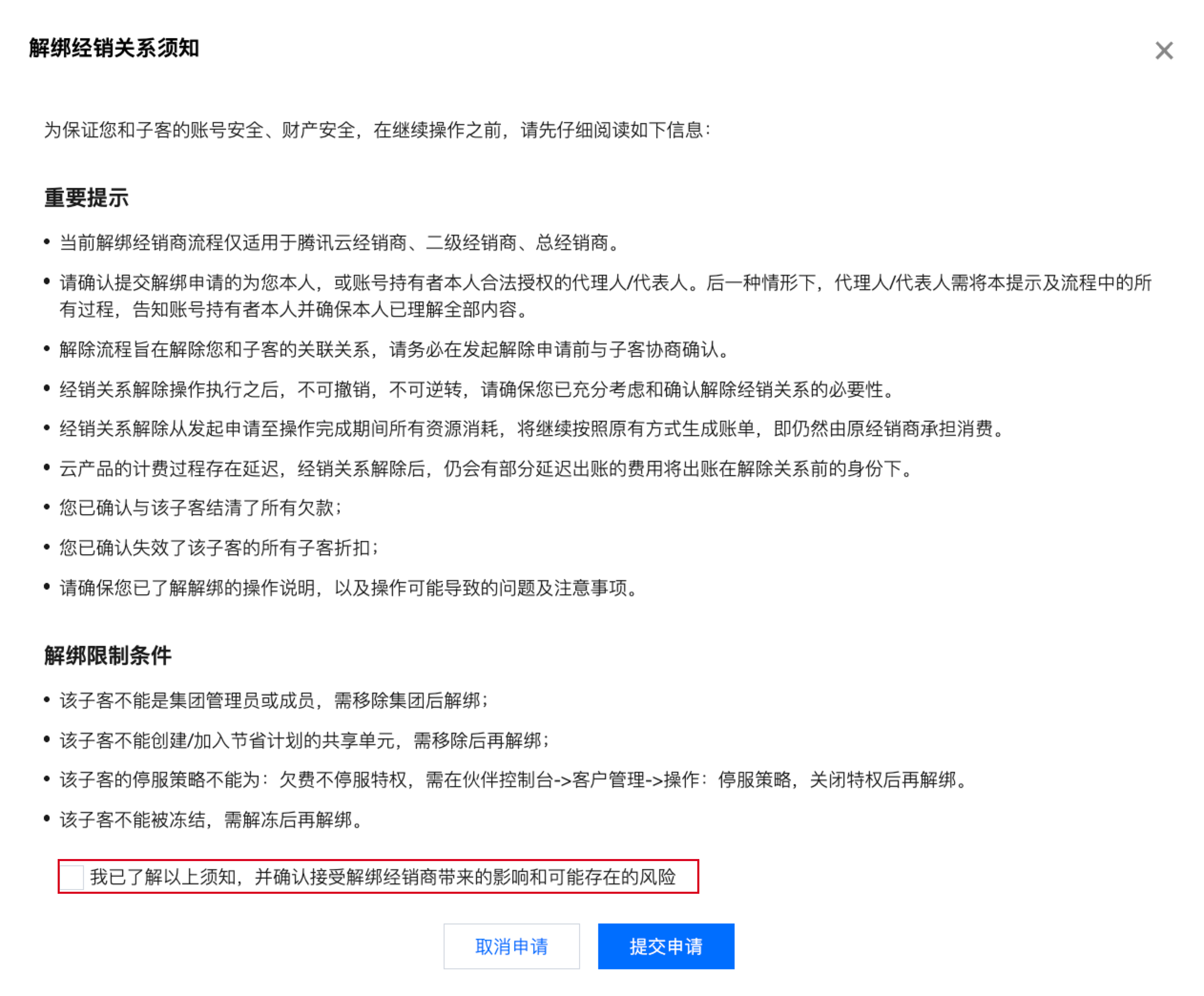 3. 阅读解绑经销关系须知,勾选"我已了解以上须知,并确认接受解绑经销商带来的影响和可能存在的风险"后,单击提交申请。