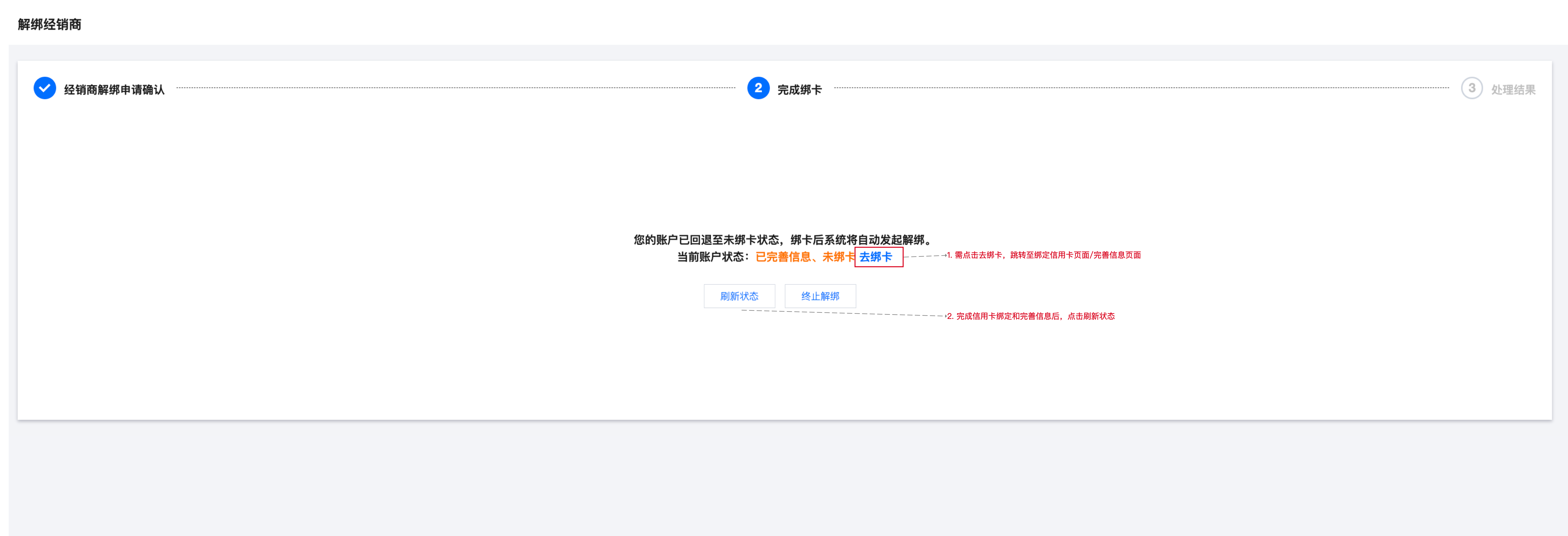 7. 完成绑卡环节后,系统将检查前置限制条件是否通过。如全部通过,则解绑完成,子客将成为腾讯云官网客户,签署的经销子客协议同步失效。