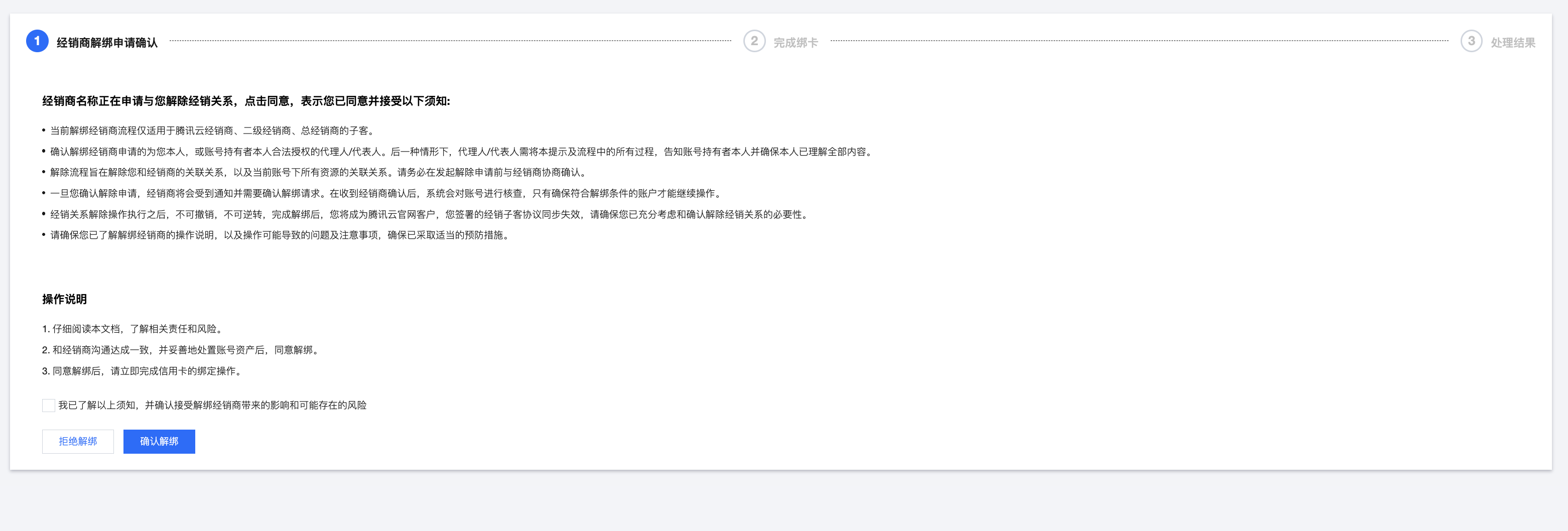 当前解绑经销商流程仅适用于腾讯云经销商、二级经销商和总经销商。