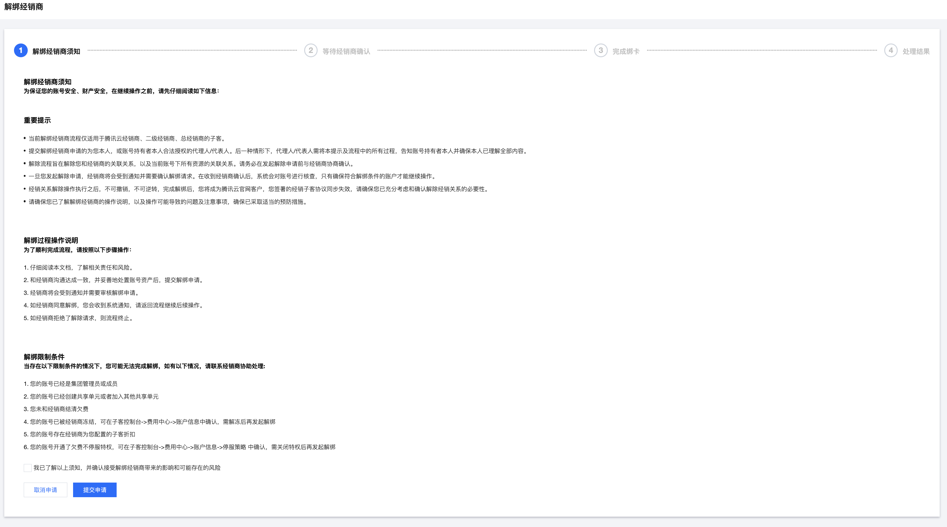 解除流程旨在解除您和经销商的关联关系,以及当前账号下所有资源的关联关系。请务必在发起解除申请前与经销商协商确认。