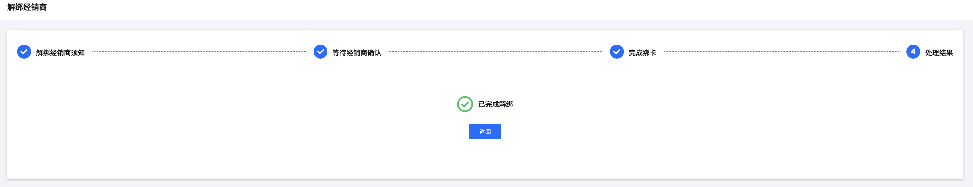 6.4 发起解绑时,系统检查前置限制条件是否通过,如全部通过,则解绑完成,您将成为腾讯云官网客户,签署的经销子客协议同步失效。