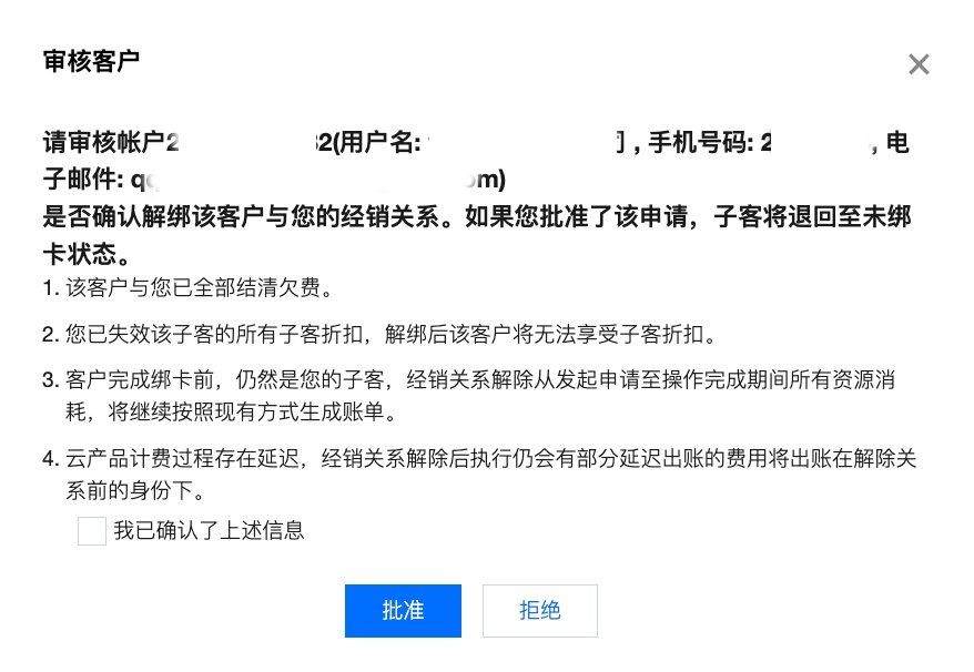 6.1 经销商单击审核后,在审核弹窗中勾选“我已确认了上述信息”,并单击批准来审批子客解绑申请。
