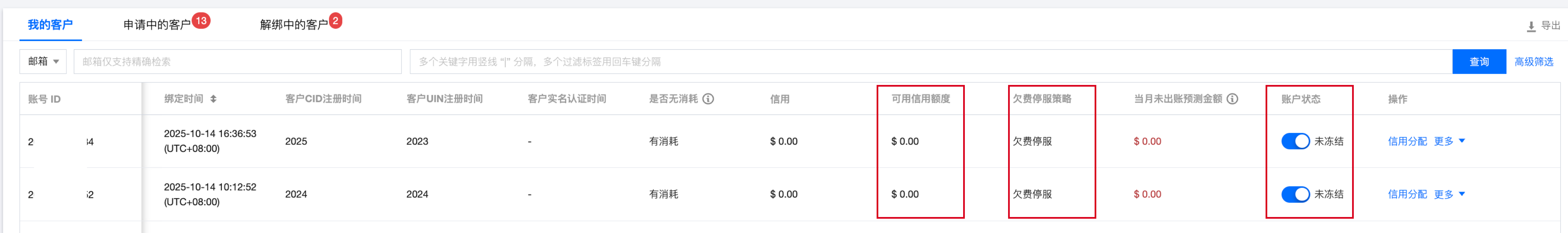 子客状态正常,非冻结状态。如已冻结子客,请先解冻子客后再解绑。可参见 子客账户冻结和恢复。 子客可用额度大于等于0。如可用额度小于0,请先给子客分配信用后再解绑。可参见 为子客分配信用。 已关闭子客欠费不停服特权。如子客有后付费、预付费不停服特权,请先关闭特权后再解绑。可参见 配置子客欠费停服策略。 解绑须知