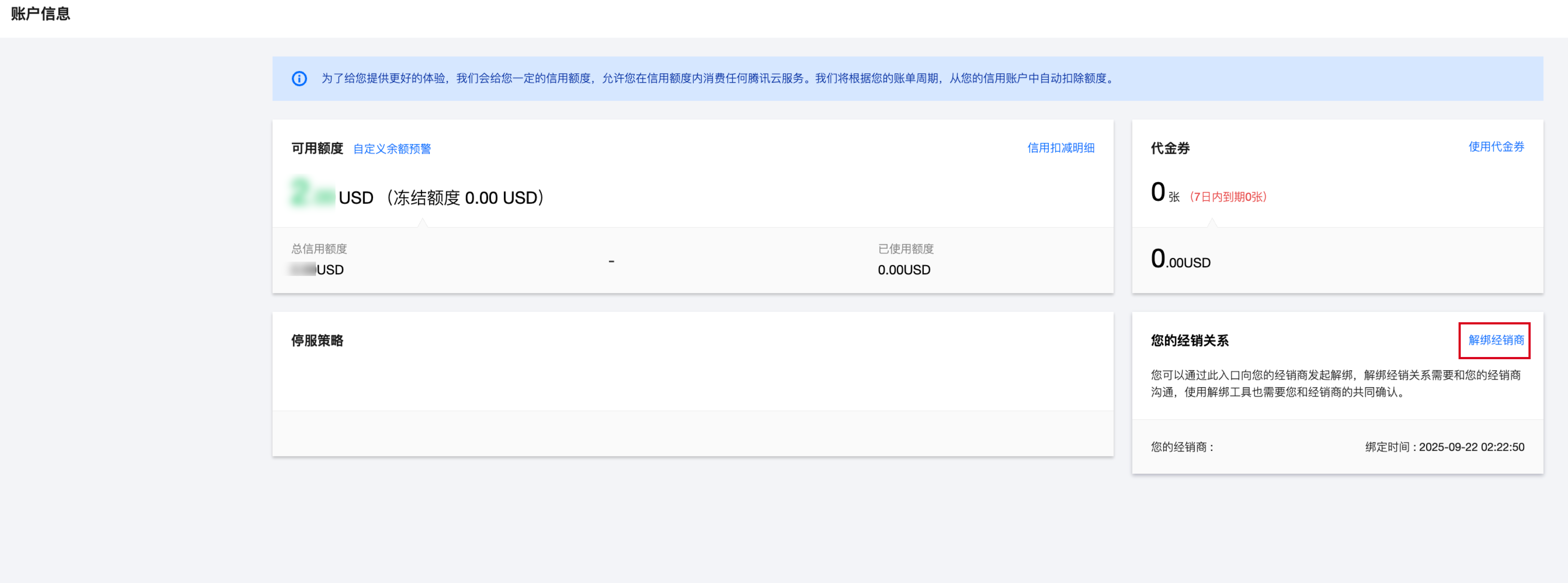 4. 您的账号已被经销商冻结,可在费用中心控制台 > 账户信息中确认,需解冻后再发起解绑。