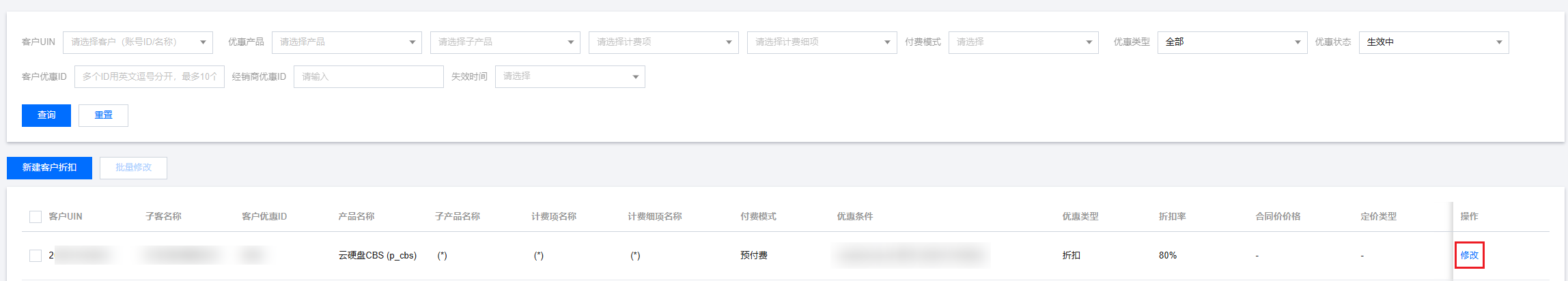 如果是一级经销商为名下间接子客配置折扣,请选择销售 > 间接子客折扣管理 进入折扣配置页面。 若需批量修改,请勾选折扣列表左侧的复选框,单击批量修改。