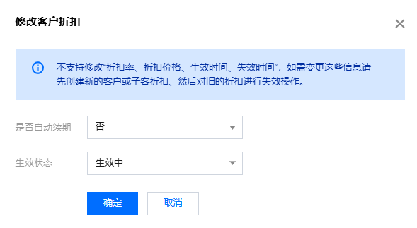 折扣提交生效后不支持修改折扣率、折扣价、生效/失效时间。如需修改这些信息请先创建新的子客折扣,然后将原有子客折扣的生效状态修改为“已失效”。