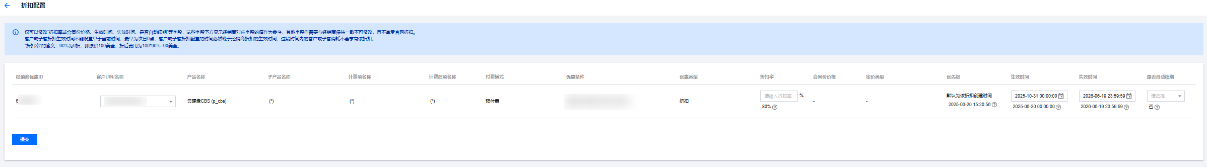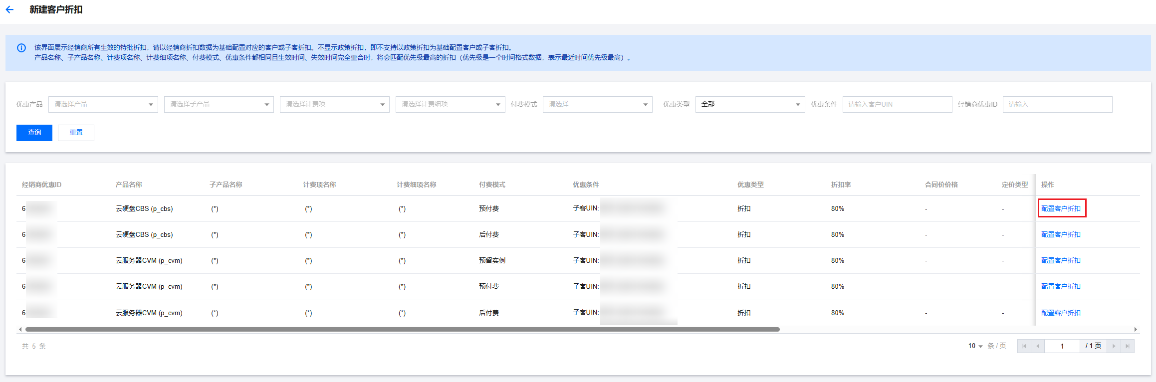 5. 选择该子客折扣的子客UIN,根据经销商折扣参考值,设置折扣率或合同价价格、折扣生效、失效时间及是否自动续期。