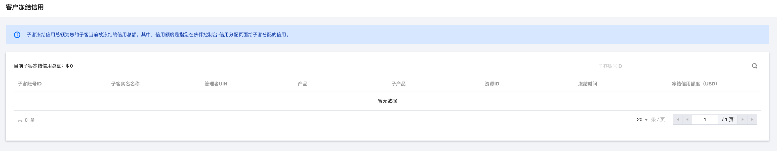 ,支持根据子客的账号 ID 精准查询被冻结的授信。其中,若子客为二级经销商的子客,则可查看管理者 UIN,即二级经销商的账号 ID。