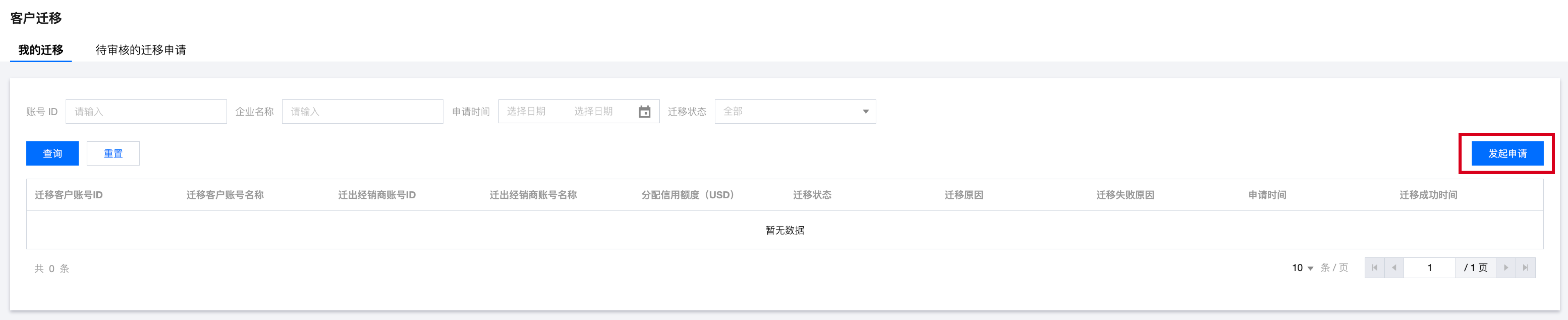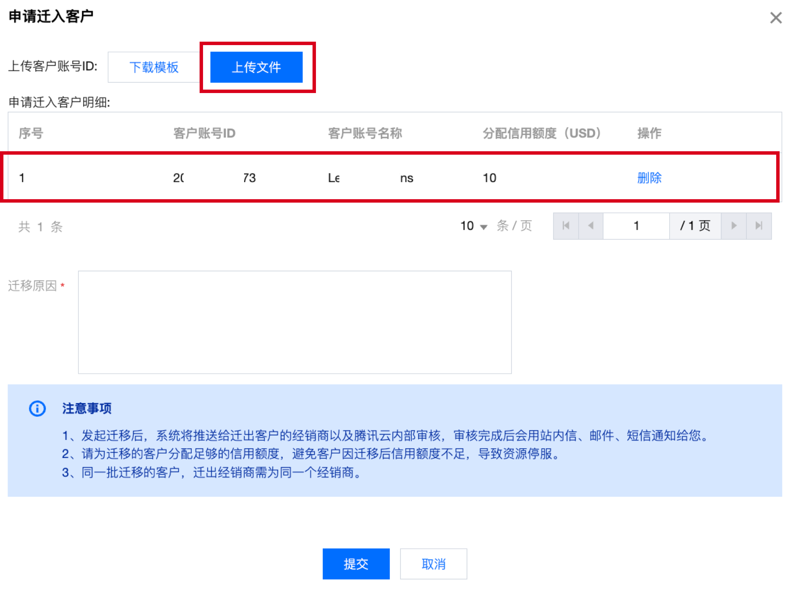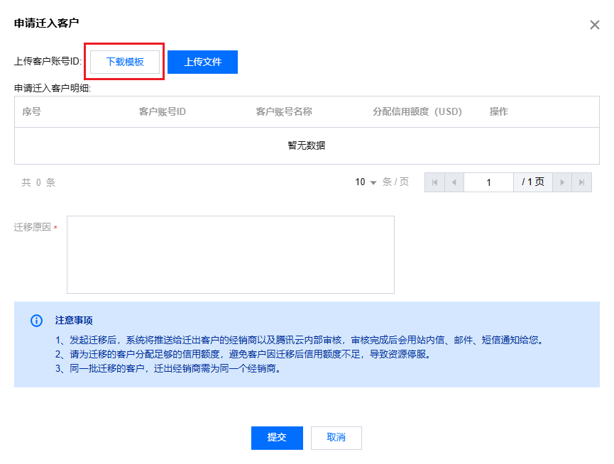 2. 进入合作伙伴中心控制台 > 客户迁移 页面,单击发起申请。 3. 单击下载模板,根据模板字段填写需迁移子客的账号 ID 及需要分配的信用额度,然后上传模板文件。