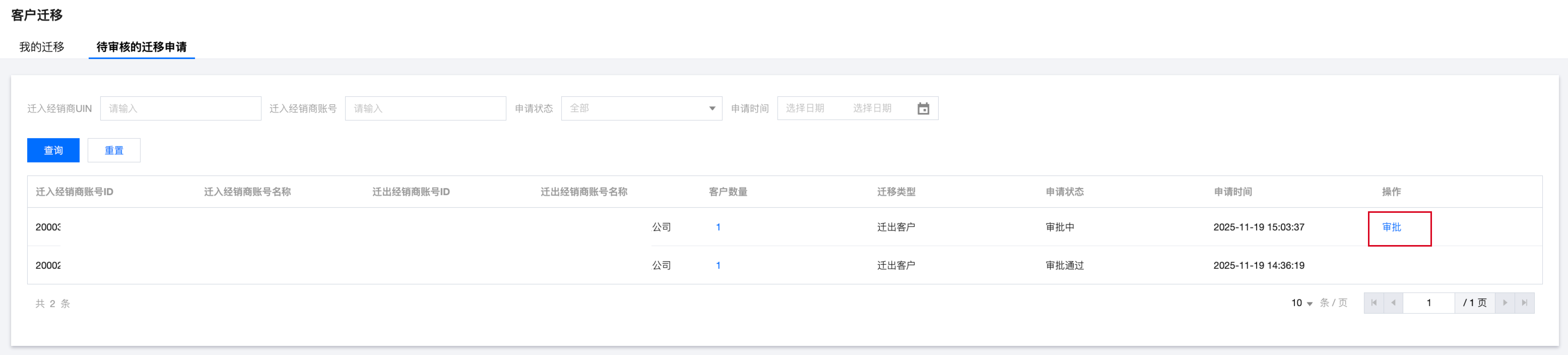 6. 迁出经销商收到您提交的迁移申请后,需在客户迁移 > 待审核的迁移申请中确认,迁出经销商可以选择审批通过/审批拒绝本次申请。