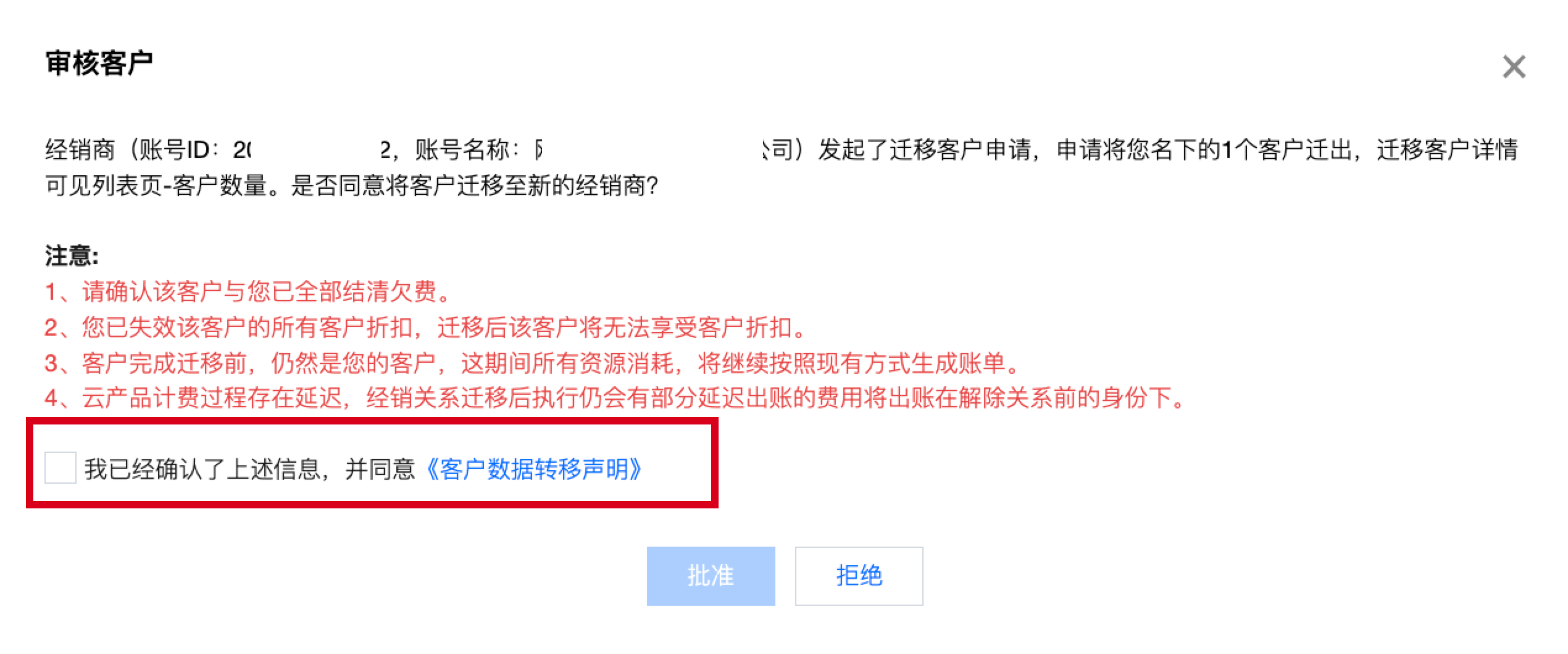 6.2 迁出经销商单击审核后,在审核弹窗中勾选“我已确认了上述信息并同意 子客数据转移声明”,并单击批准来审批迁移申请。 7. 完成迁出经销商审核后,系统将推送至腾讯云内部审核,如需了解内部审核进度,请联系您的商务经理。当腾讯云内部审核通过后,系统将给您发送邮件、站内信、短信通知。