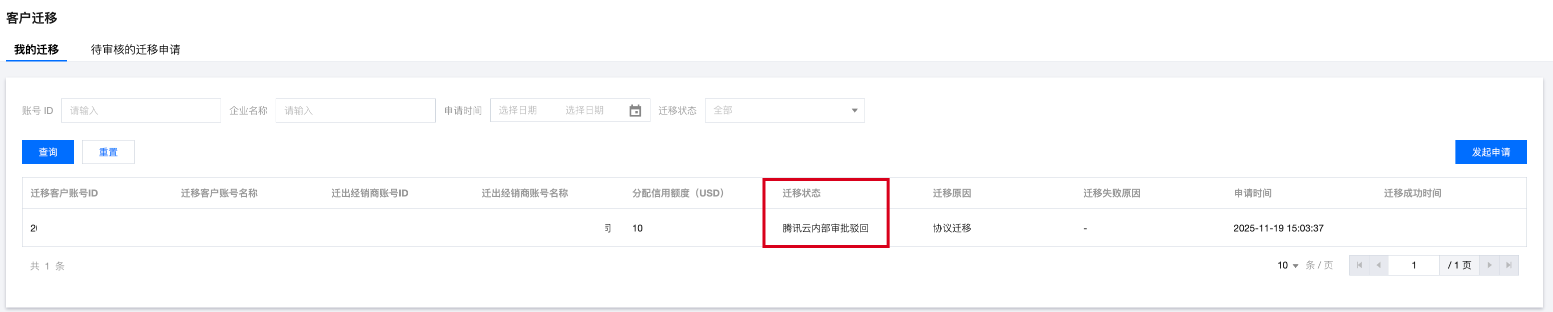 5. 提交后,待迁移子客生成迁移记录,需迁出经销商、腾讯云内部审核全部通过后,才能完成迁移。您可关注客户迁移 > 我的迁移中每个子客的迁移状态。