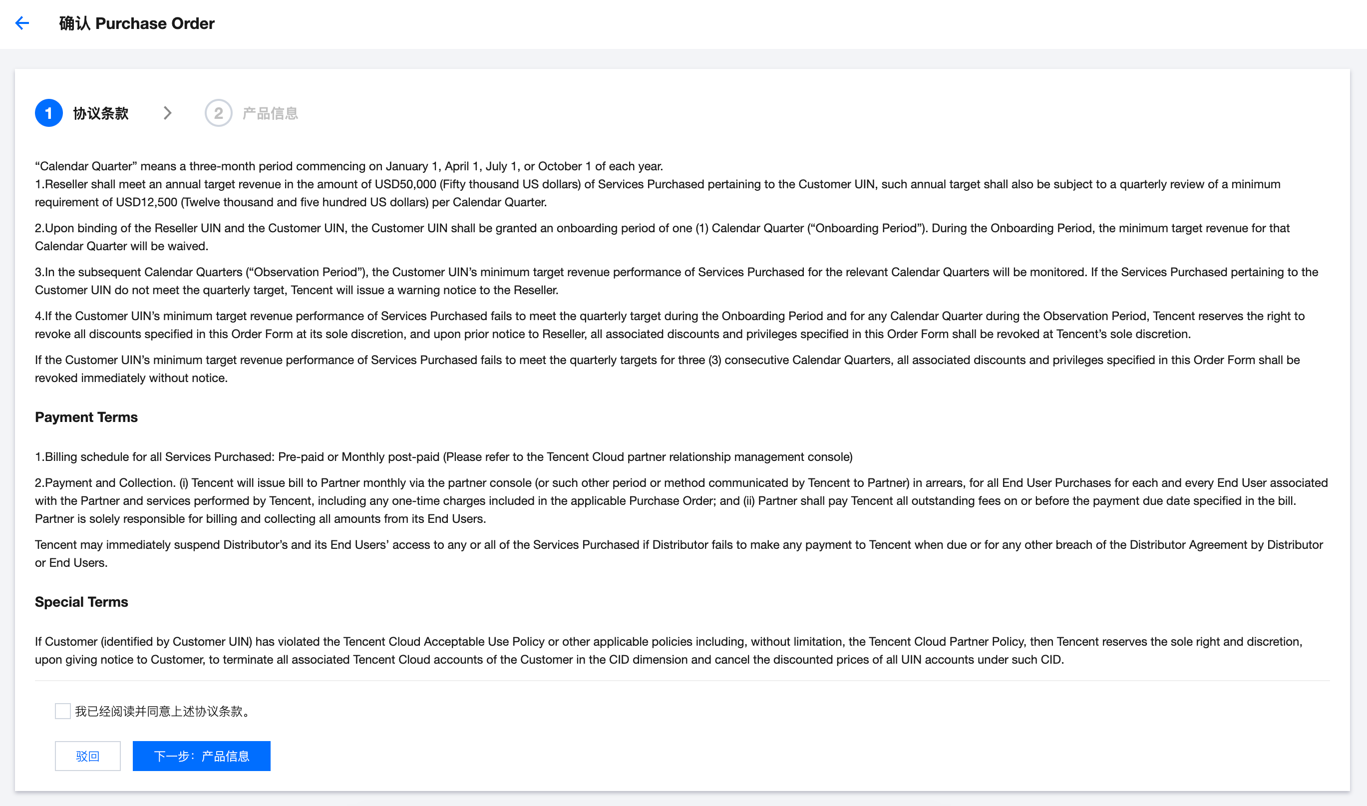 本文档截图中的协议条款仅做演示,实际协议条款以合作伙伴中心的为准。