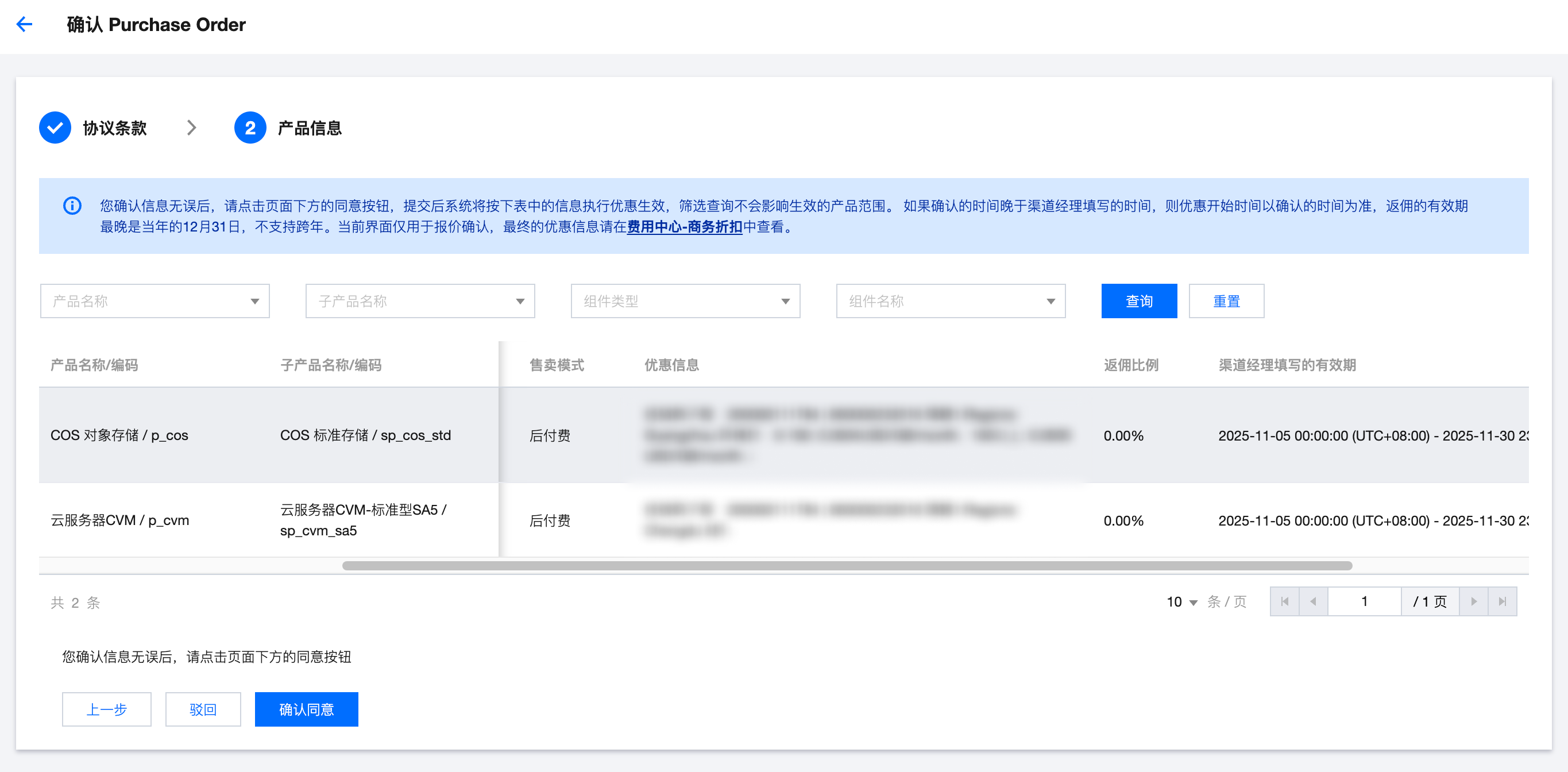 2. 产品信息页面显示报价的相关信息,可左右滚动页面查看完整信息。单击确认同意,上述的报价信息将会在系统中生效。