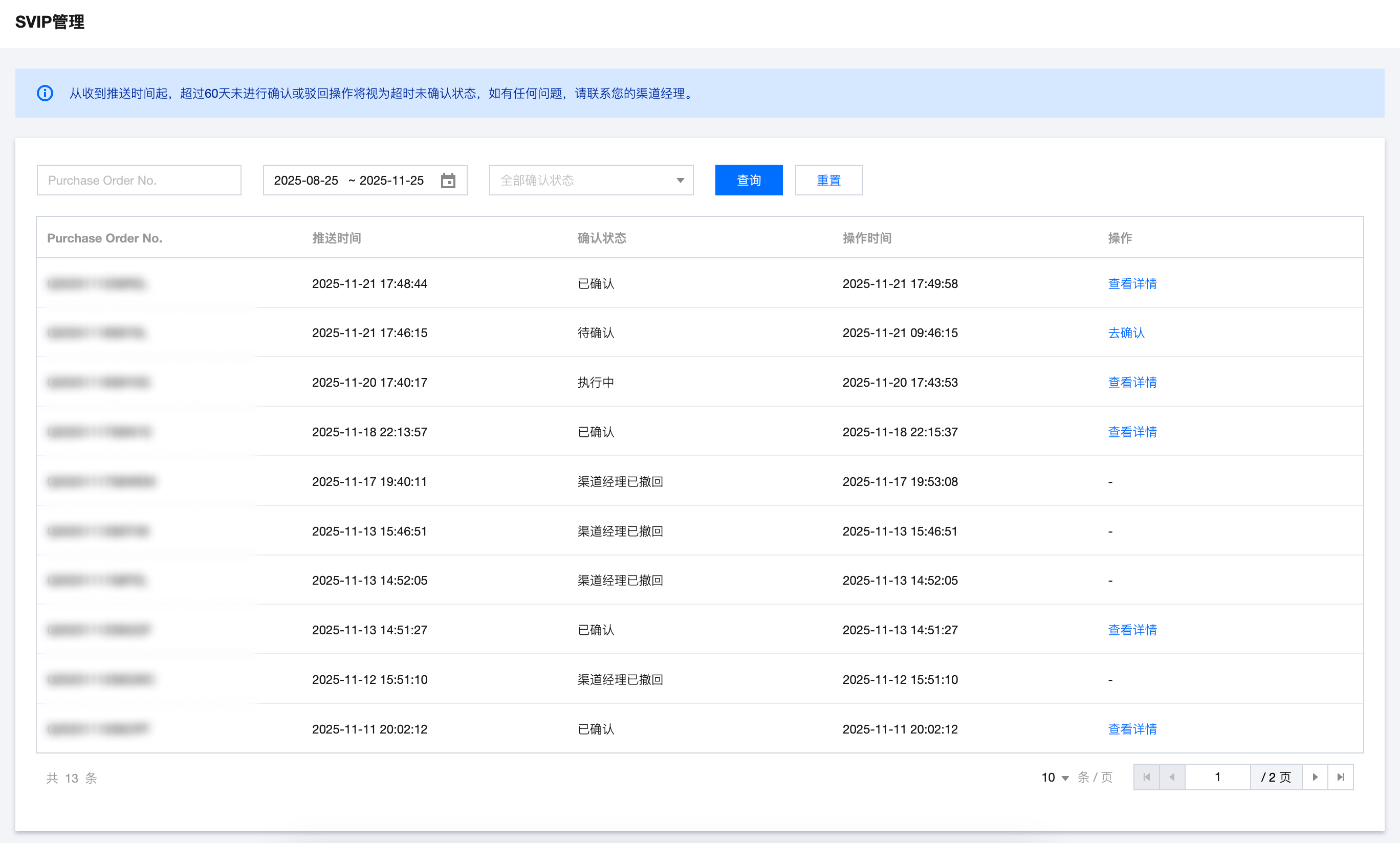 推送时间:商务经理将该单据推送到合作伙伴中心的时间,从收到推送时间起,超过60天未进行确认或驳回操作将视为超时未确认状态。