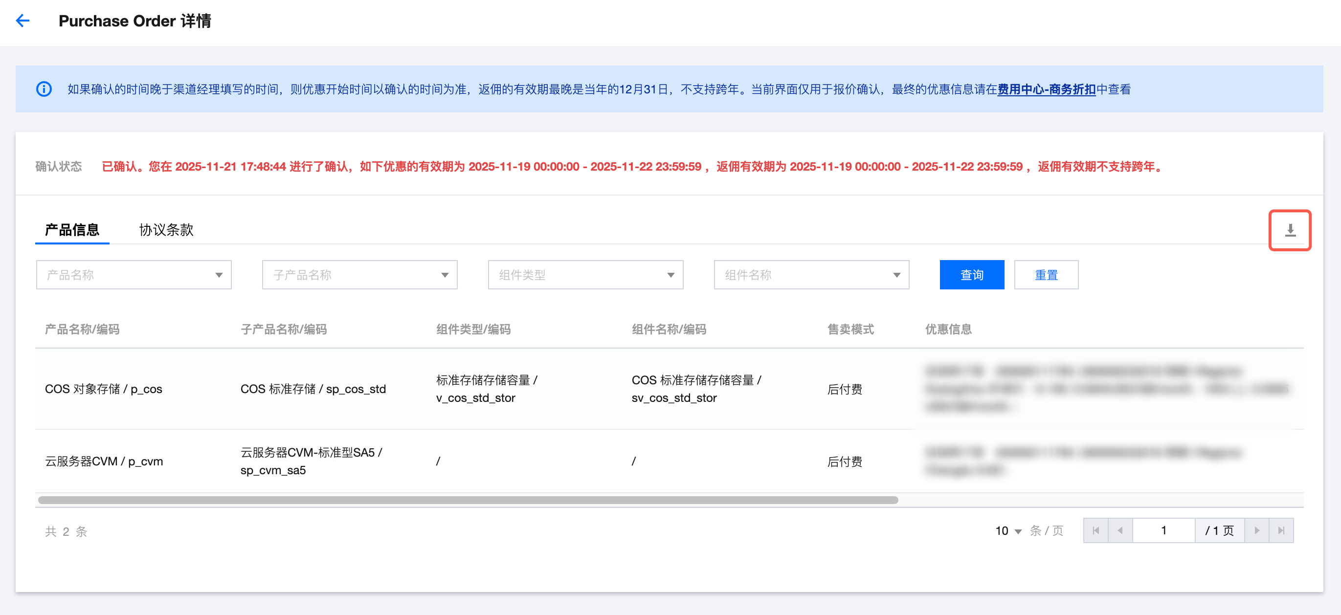 进入已确认的单据的详情页,默认显示产品信息,单击页签可切换查看协议条款。单击页签右侧的 ,可将该单据对应的服务条款及产品信息以 PDF 格式文件下载到本地。