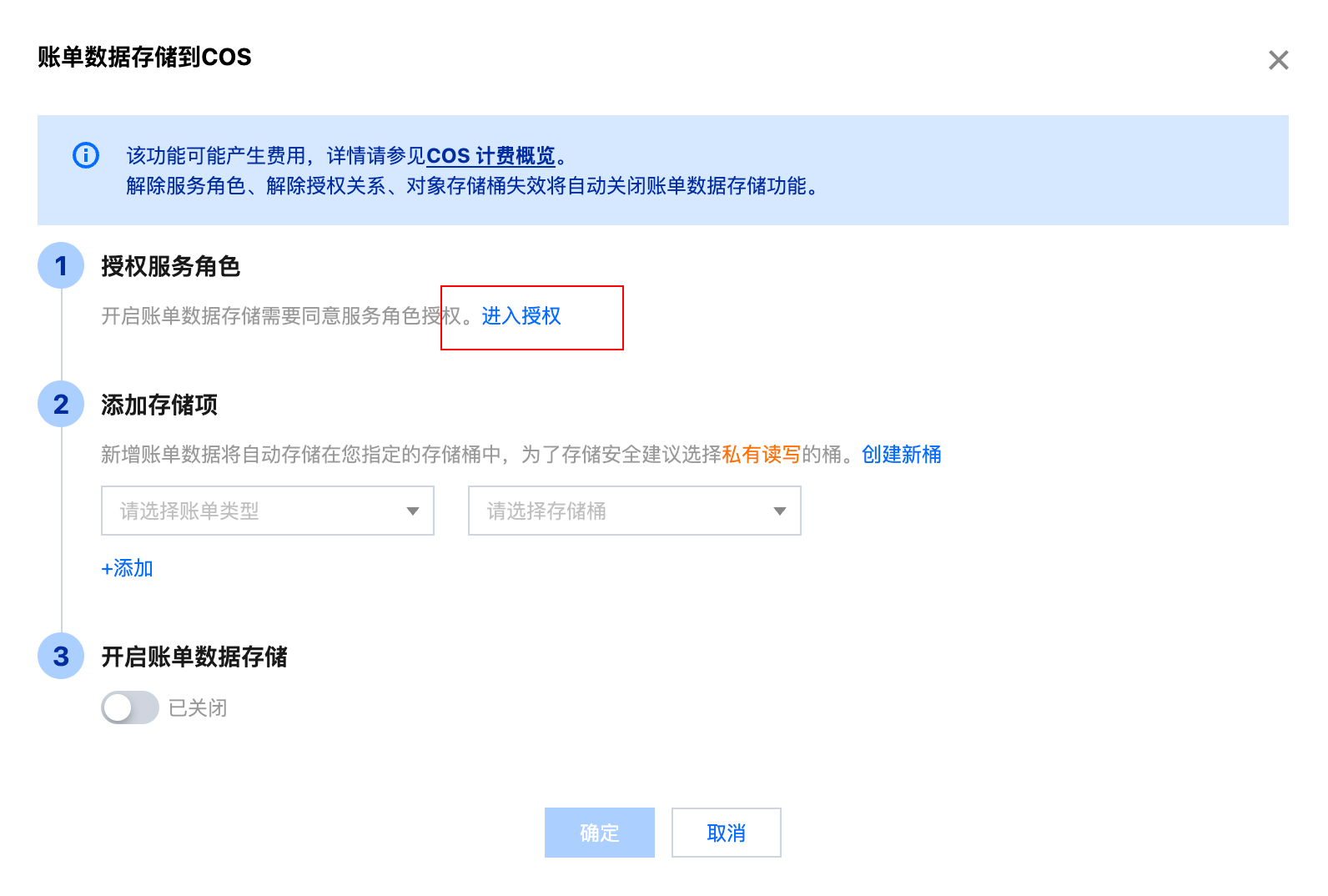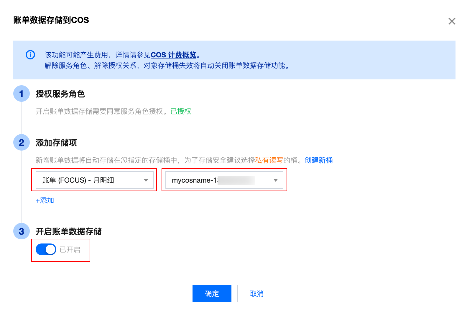 5. 选择需要存储的账单类型、选择需要存储账单的 COS 桶,并开启账单数据存储开关,单击确定,即可开启该功能。
