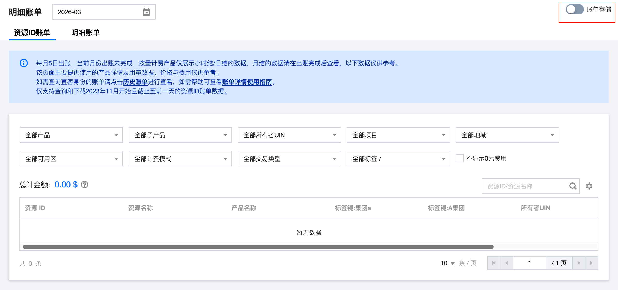 如需关闭账单存储功能,将上述步骤中账单数据存储的开关设置为已关闭状态,并单击确定即可。
