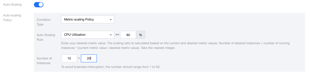 指标弹性策略:填写您期望的指标值 ,根据当前指标和期望指标来计算扩缩比例。