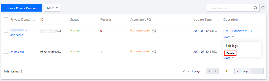 删除私有域时,如该私有域名已关联 VPC,需先解除关联 VPC 后方可删除私有域。