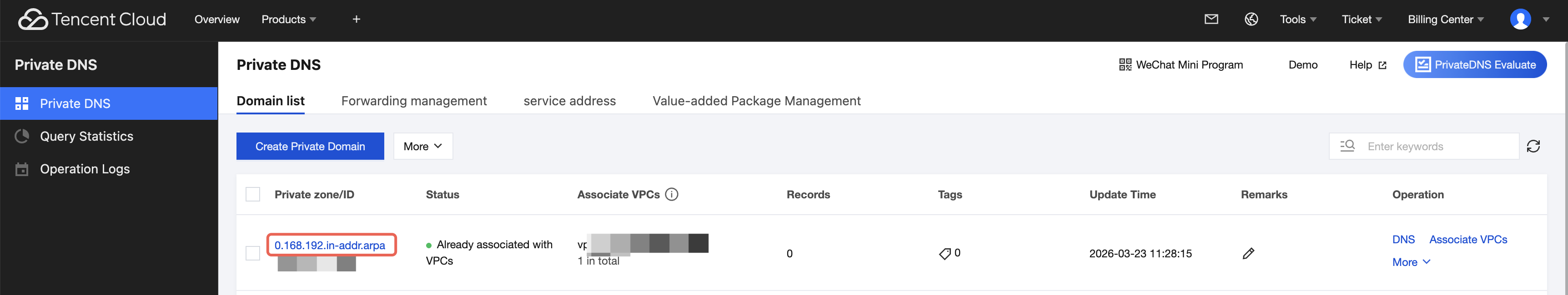 若现有的 VPC 不符合您的要求,请您前往 VPC 控制台 进行修改。 4. 单击确定,即可完成添加反向私有域操作,您可直接进入该域名的解析记录页添加 PTR 记录。如下图所示: