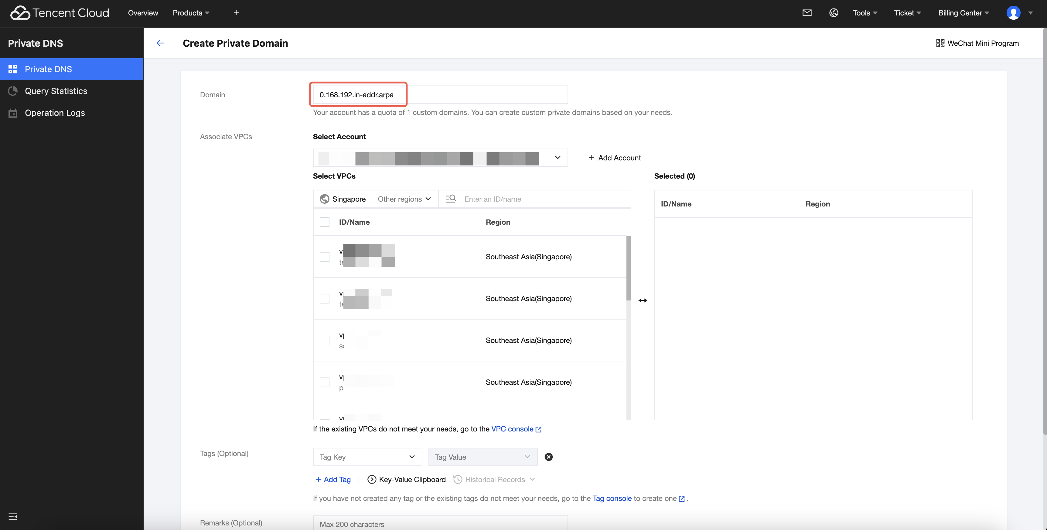 3. 在 “新建私有域” 管理页面中,输入反向解析域名并选择 VPC。