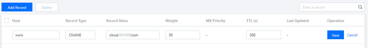 3. 在解析记录页签中,单击添加记录并填写相关记录值信息。如下图所示: