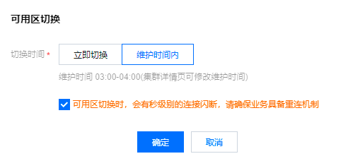 3. 在弹出的对话框,选择立即切换或维护时间内切换,勾选“可用区切换时,会有秒级别的连接闪断,请确保业务具备重连机制”,单击确定。