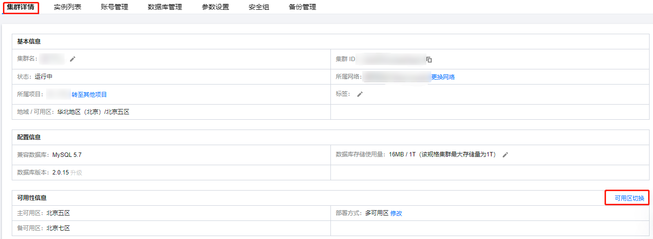 4. 待集群状态为运行中时,可在集群详情页可用性信息处查看切换的可用区。