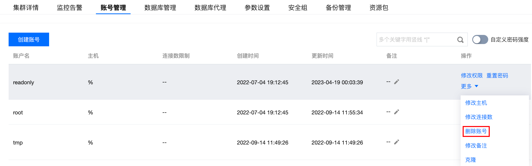 3. 在集群管理页面,选择账号管理页,在账号列表找到需要删除的账号,在其操作列选择更多 > 删除账号。