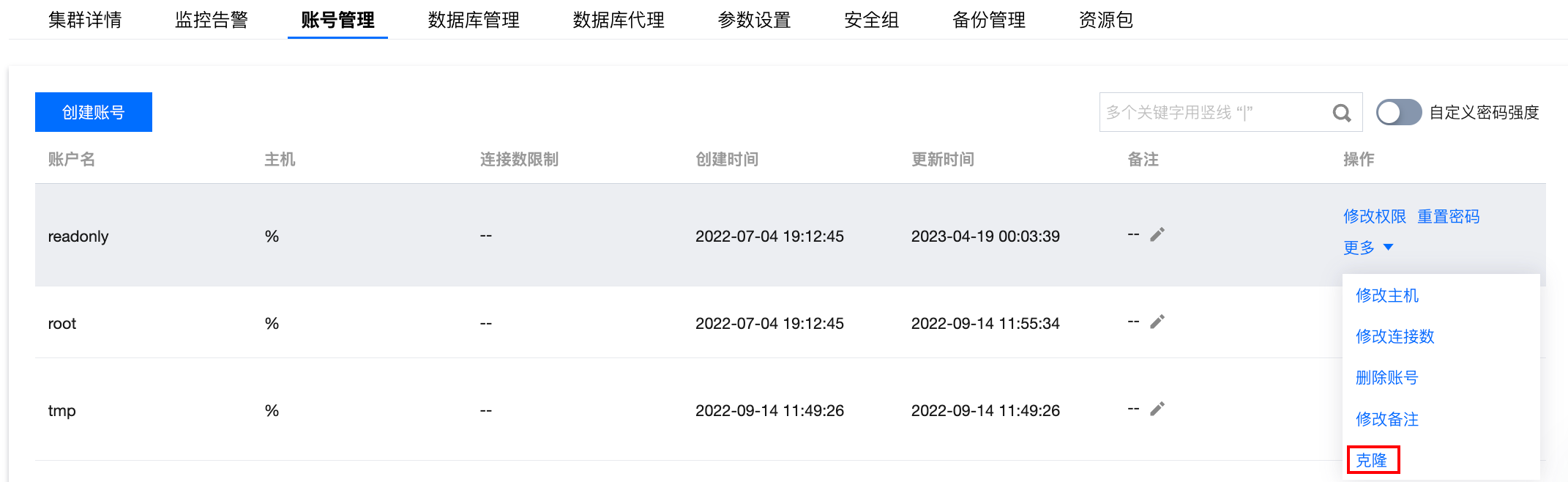本文为您介绍通过控制台,对账号进行克隆操作,可直接继承原账号的账号名、主机、备注信息以及账号权限信息。