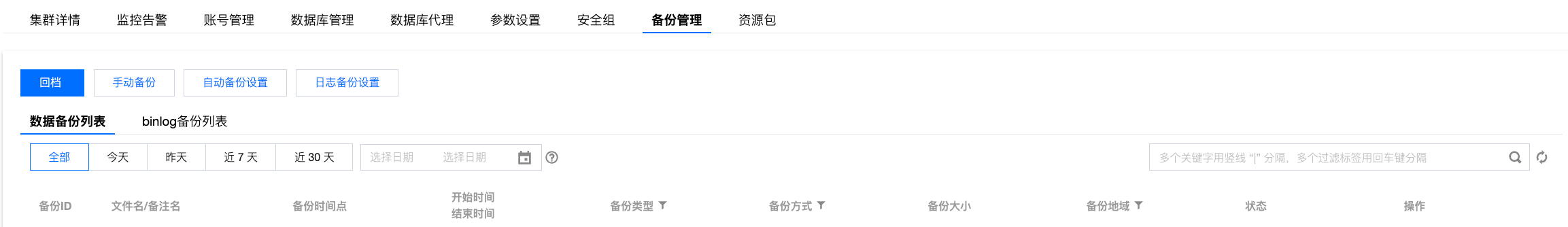 您可通过可视化列表查询数据备份列表的字段信息,包括:文件名/备注名、备份时间点、开始时间、结束时间、备份类型、备份方式、 备份大小、状态以及操作等;可查询 binlog 备份列表的字段信息,包括:文件名、binlog 数据开始时间、binlog 数据结束时间、备份大小以及操作等,方便您对历史备份进行查询和管理。