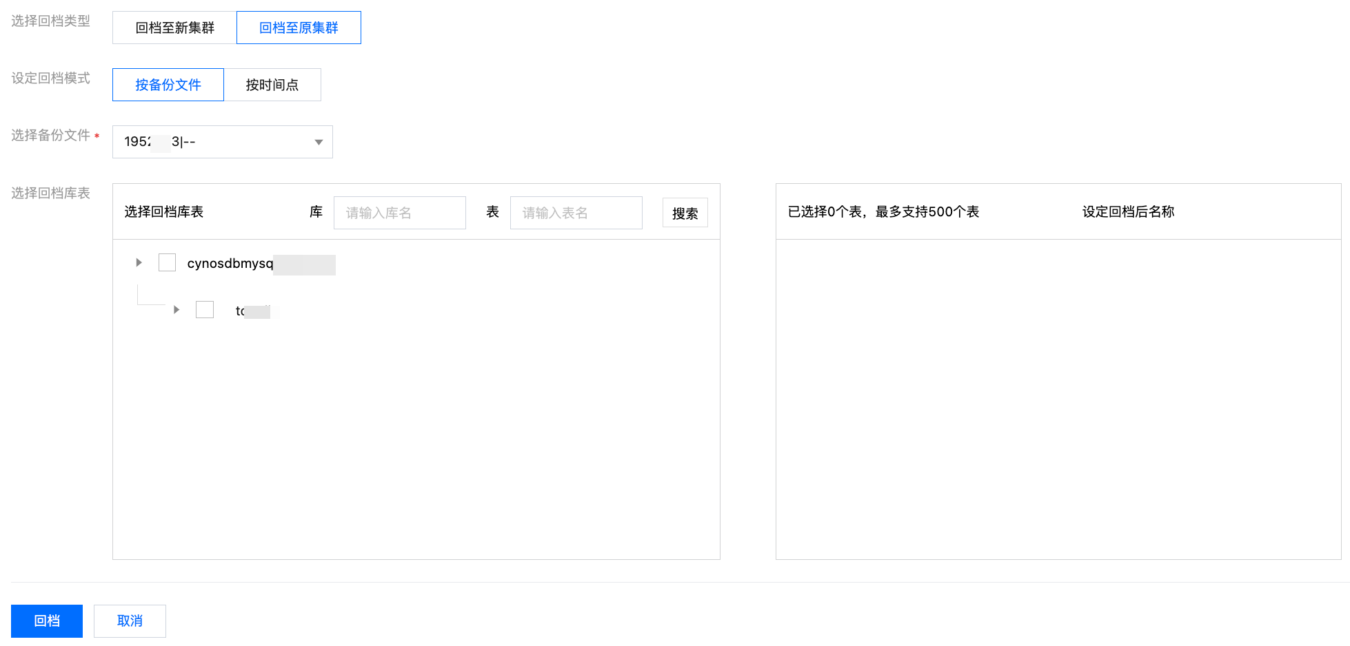 选择备份文件 | 若回档模式设定为按备份文件,则需选择已有的用于回档的快照备份文件,然后选择回档的库表即可。 |
