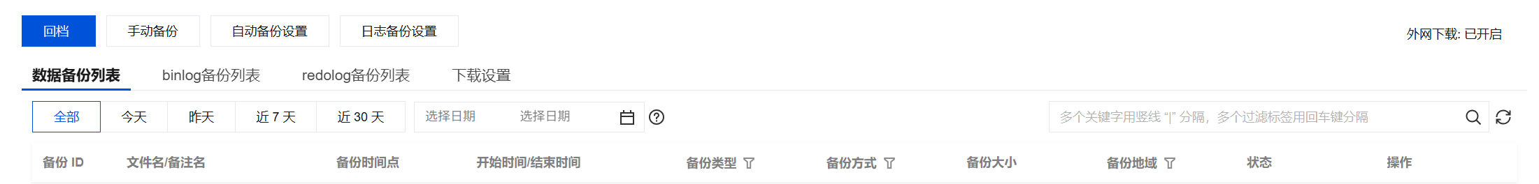 数据备份和 binlog 备份支持在右侧搜索框进行快速过滤。