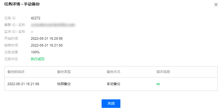 选择备份类型 | 支持快照备份和逻辑备份。 注意: 逻辑备份会对数据库加锁,在手动备份期间会影响数据库的使用,建议在业务低峰期进行逻辑备份操作。 |