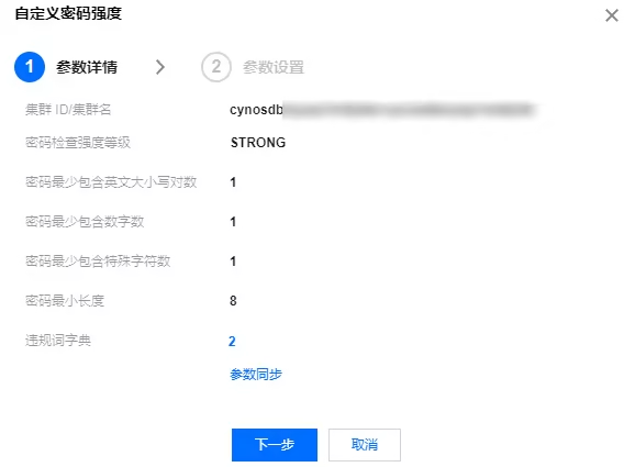 若您使用的是子账号登录控制台,需确保该子账号有被授权使用自定义密码强度的参数同步功能,详细授权功能名称和操作请参见 授权子用户使用功能。 为集群开启自定义密码强度功能后,支持通过参数同步功能,将当前集群所设置的自定义密码强度参数包括违禁词字典,同步至该腾讯云账号下管理的同地域的其他集群,若同步的集群未开启该功能,则会进行功能开启并同步参数。