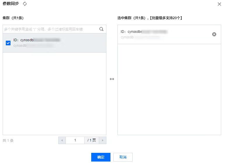 5. 在参数同步界面,勾选需要同步的集群(支持多选或取消已选择的集群),单击确定。