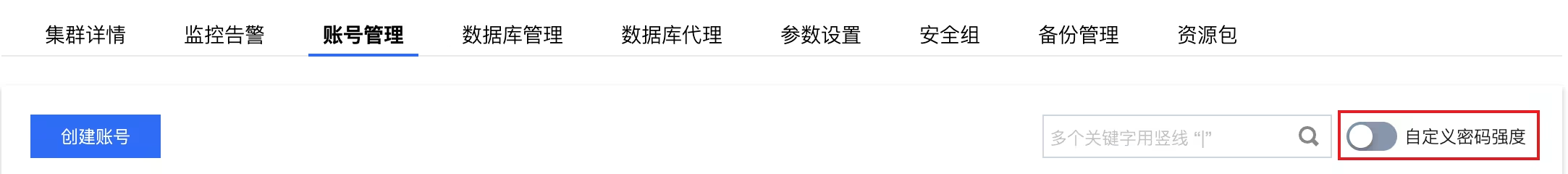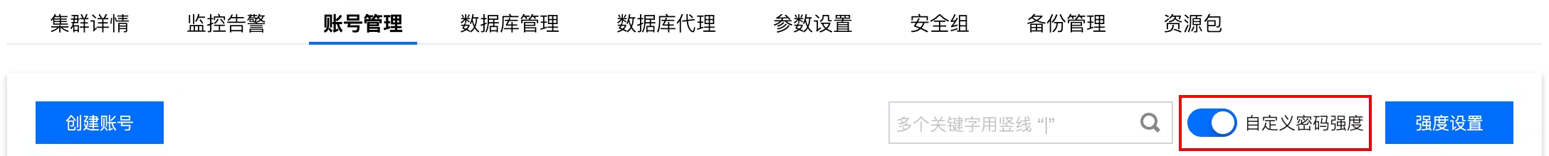 密码检查强度等级 | 支持选择检查强度为 MEDIUM 或 STRONG。 MEDIUM:该设置下插件检查长度、数字、大小写、特殊符号。 STRONG:该设置下插件检查长度、数字、大小写、特殊符号及违规词字典。 |