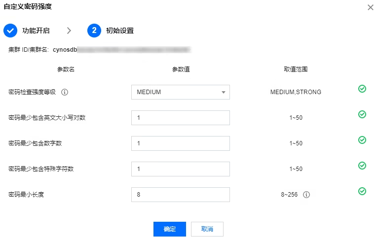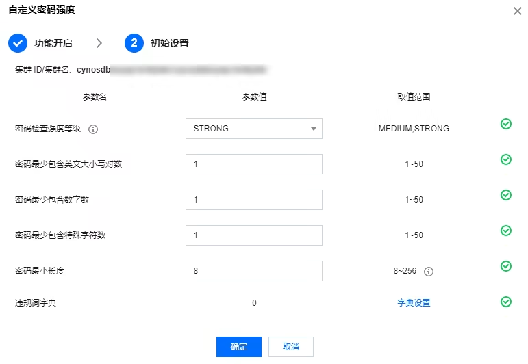 密码最少包含特殊字符数 | 密码最少要包含的特殊字符个数,默认值为1,取值范围1 - 50。 |