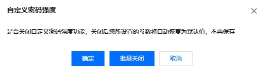 违规词字典 | 当密码检查强度等级为 STRONG 时,此选项可以设置,可单击字典设置跳转操作。违规词内容输入要求:单词长度4 - 100,须为英文大小写字母。设置完成后,密码设置校验时将对密码中是否有完整的违禁词进行检查,若存在违禁词,无论大小写,将不予通过。 |