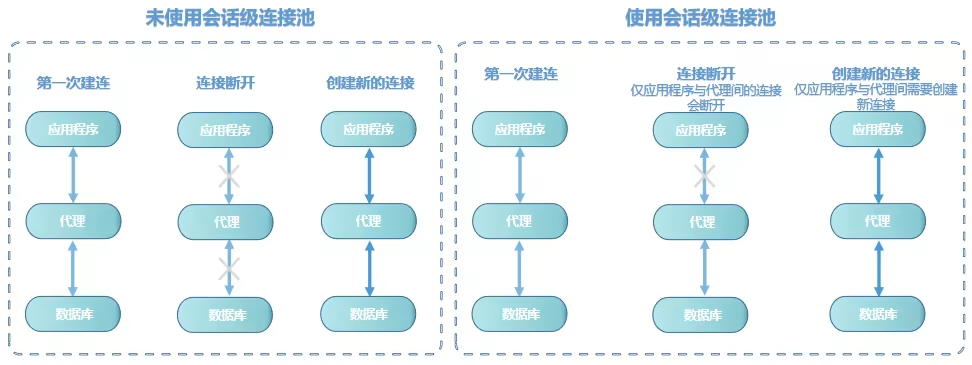 会话级连接池主要用于减少短连接业务频繁建立新连接带来的实例负载。当某客户端连接断开时,系统会判断当前连接是否为闲置连接,如果是闲置连接,系统会将该连接放到代理的连接池中并保留一小段时间(系统默认为5秒,支持 设置连接保留阈值)。
