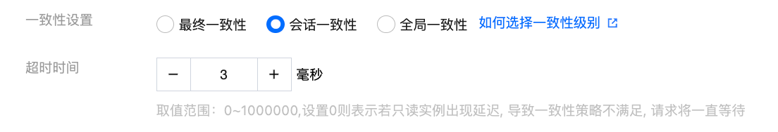 若一致性设置为会话一致性或全局一致性,您需对读写实例和只读实例之间的数据复制设置超时时间,取值范围:0 - 1000000毫秒,设置为0,则表示若只读实例出现延迟,导致一致性策略不满足,请求将一直等待,设置为非0,如设置1000毫秒,则表示若只读实例出现延迟,超过设置的1000毫秒后,请求将由系统自动转发到主实例。