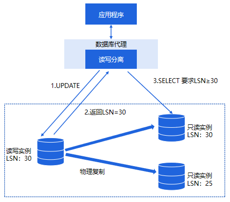在 TDSQL-C MySQL 版的链路中间层做读写分离的同时,中间层会追溯各个节点已经应用的日志位点,即日志序号(Log Sequence Number,简称 LSN)。同时每次数据更新时 TDSQL-C MySQL 版会记录此次更新的位点为 Session LSN。当有新请求到来时, TDSQL-C MySQL 版会比较 Session LSN 和当前各个实例的 LSN,仅将请求发往 LSN 大于或等于 Session LSN 的实例,从而保证了会话一致性。