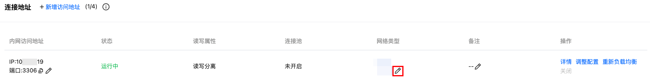 3. 在数据库代理页的概览 > 连接地址 > 网络类型下,单击编辑图标。