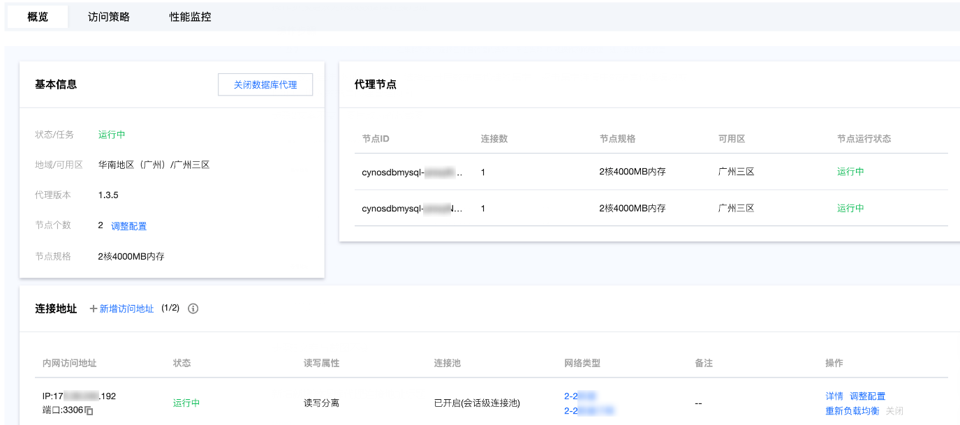 4. 开通成功后,可在数据库代理页查看基本信息,管理代理节点,也可在连接地址项对数据库代理地址、网络类型修改和添加备注。