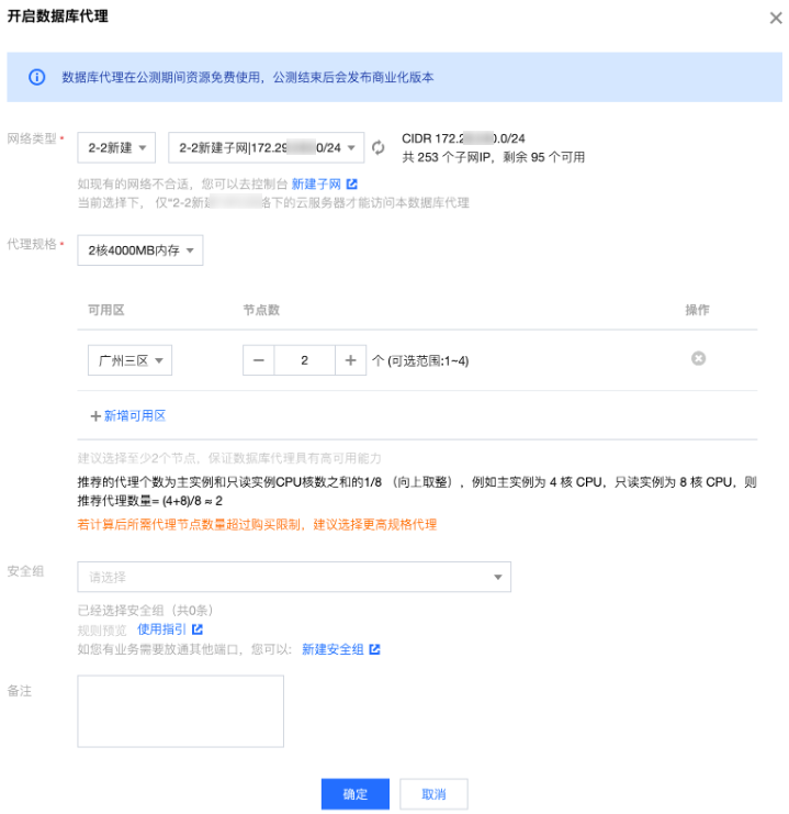 可用区及节点个数 | 1. 选择数据库代理可用区,支持单击新增可用区来多选,可选择的可用区数量与当前地域可选可用区数量相关。 2. 选择节点个数,推荐的代理节点个数为主实例和只读实例 CPU 核数的之和的1/8(向上取整),例如主实例为4核 CPU,只读实例为8核 CPU,则推荐代理数量 = (4 + 8) / 8 ≈ 2,当前版本最多支持选择4个数据库代理节点,建议选择至少2个节点,保证数据库代理具有高可用能力。 3. 若您的集群为多可用区部署,为保证数据库代理高可用性,推荐您在主备可用区均配置数据库代理节点,且节点数量为一致。 注意: 如果所选数据库代理与主实例不在同一可用区,通过数据库代理连接时,写入性能可能会下降。 若计算推荐节点个数后所需代理节点数量超过购买限制,建议选择更高规格代理。 |